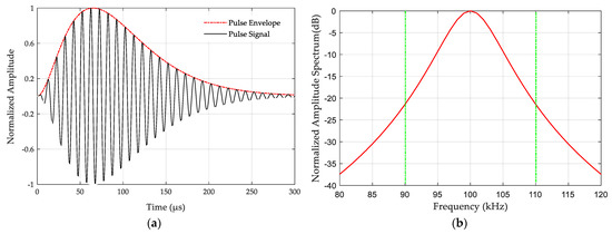 where is time (), A is a normalization constant related to the peak amplitude, is the carrier frequency of 100 kHz, is the envelope-to-cycle difference (ECD) (), and is the phase-code parameter, which is 0 for positive phase-coded (PC) pulses and for negative PC pulses. The eLoran pulse signal is generated according to Equation (1). The time–domain and frequency–domain characteristics of a single eLoran signal are shown in Figure 1. It can be seen that the leading edge of the signal first rises rapidly, reaching a peak at 65 μs, and then falls rapidly.