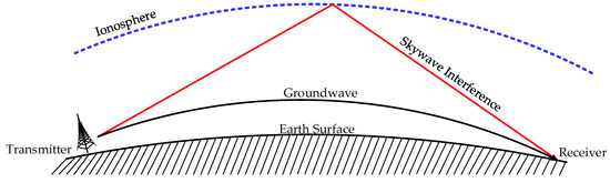 The eLoran signal belongs to an LW frequency band with a carrier frequency of 100 kHz. According to the propagation theory of this frequency band, the eLoran signal mainly reaches the receiving point through two paths: (i) as a groundwave signal (surface wave) transmitted along the surface of the Earth, and (ii) as a skywave signal (space wave) produced by one or more reflections between the ionosphere and the ground when the signal is projected to the ionosphere at a certain elevation angle. Generally, only one-hop skywave is considered for receiving points with a receiving distance of less than 2000 km [34]. The propagation path of the eLoran signal is shown in Figure 3.