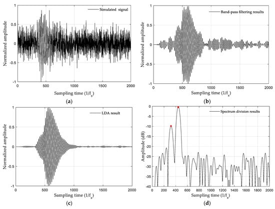 The Equation (10) is a sine wave with variable , and the frequency of sine wave is . Therefore, the result of the spectrum division of the received signal in Equation (9) becomes an estimate of two continuous wave frequencies and . The amplitude ratio is the ratio of the amplitudes of the two continuous waves.