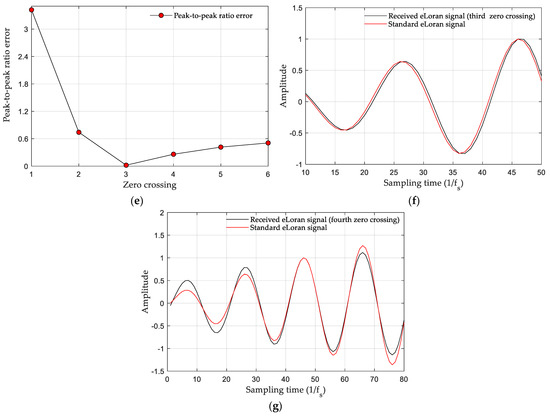 Because the eLoran signal was distorted during propagation and signal processing, which can lead to deviations in the peak-to-peak ratios, when , we determined that the zero crossing was the closest to the SZC. Thus, the peak-to-peak ratio results contained multiple possible SZCs. Therefore, we used waveform matching to calculate the root mean square (RMS) error between the received signal and the standard waveform over a cycle of time. The minimum value of the RMS error corresponded to the zero crossing to determine the SZC. The waveform-matching calculation formula was as follows:
