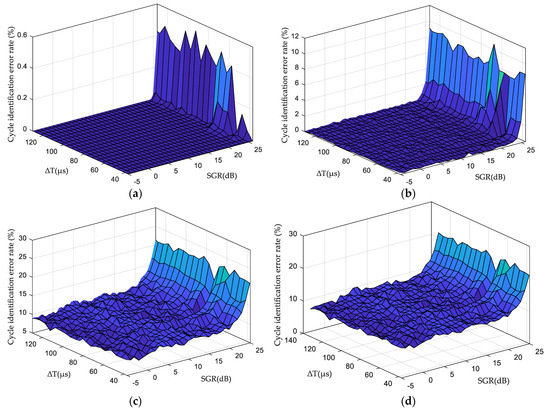 We simulated the parameter estimation performance of the cycle identification method under SNR = 0, −5, −10, and −13 dB. Figure 9 shows the error rate of cycle identification when SGR = 5–10 dB and = 37–150 μs.
