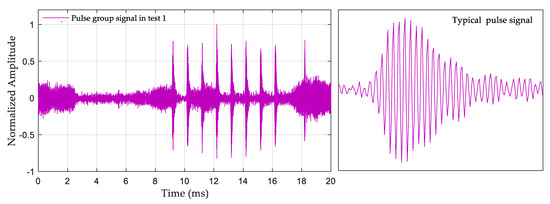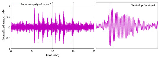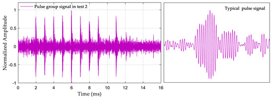 The environments of the three selected test points were different. Test 1 was in a closed indoor environment, and Figure 12 shows the collected eLoran signal. It can be seen that although the receiving distance was short and there was only a groundwave signal, the signal was full of pulse interference. Test 2 was in the surrounding open environment, and Figure 13 shows the collected eLoran signal. It can be seen that there was SWI in the signal, which made the second half of the groundwave distorted. Test 3 was in a mountainous location at a large circle distance, and Figure 14 shows the collected eLoran signal. Not only was the skywave interference for this test strong, but the SNR was also very small, which made the groundwave signal severely distorted.
