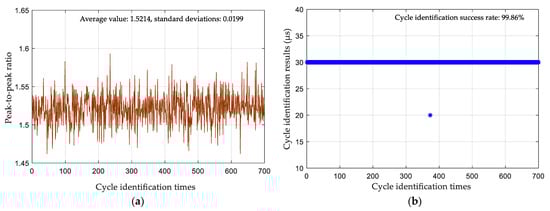 Results of cycle identification for Test 3: (a) peak–peak ratio; (b) cycle identification result.