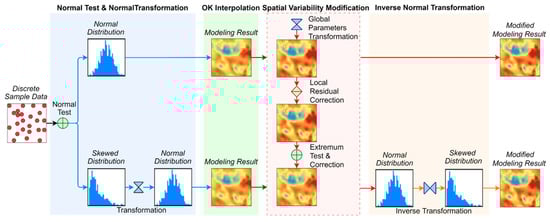 Schematic diagram of processing steps. The blue panel is the first step, which is to test the normality of the discrete sample data, and to perform the normal transformation if the sample data distribution has non-normality. The green panel is the second step, which is to construct a spatially continuous surface model by OK interpolation. The pink panel is the third step, which is to modify the spatial variability of the surface model by global parameters transformation and local residual correction. The orange panel is the fourth step, which is to carry out the inverse normal transformation for the processing results of normal transformation to obtain the original scale.