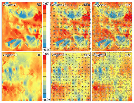 Firstly, the residuals on the SPs can be obtained from the measured value and the value after GPT (Equation (9)). Then, OK interpolation is performed again on the residuals at the SPs to estimate the residuals at all the EPs. Finally, the local residual correction results can be obtained by removing the residual part from the EPs’ value (Equation (10)). It should be noted here that since increasing the number of sample points involved in the estimation can intensify the “smoothing effect”, the interpolation of the residuals should be performed with a minimum number of local neighbor SPs to avoid the “smoothing effect” [35] on the residual estimation. The four SPs nearest to each EP in the local neighborhood are used in the calculation to avoid the “smoothing effect”.
