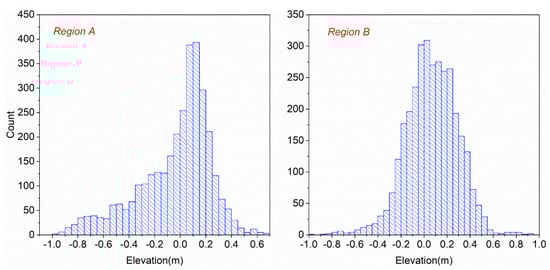 Two regions with strong spatial variability (A and B) located on an island in China were selected as experimental objects. The raw data (RD) for them are both 52 × 63 raster format DEM (Figure 2) from the State Key Laboratory of Resources and Environmental Information System, Institute of Geographic Sciences and Natural Resources Research, Chinese Academy of Sciences (http://www.lreis.ac.cn/ (accessed on 30 October 2021)). Sample data (50%) and test data (the remaining 50%) were generated by random sampling from the RD for modeling estimation and verification. The data in region A showed skewed distribution and those in region B showed normal distribution, as shown in Figure 3.