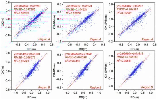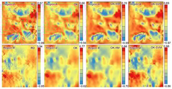 The three methods use the same model parameter settings for comparison. The search neighborhood type is circular, with four sectors and 45° offset, the number of samples in the neighborhood is 10 points, and the semi-variogram fitting models are all spherical models. The reconstruction results are consistent with the spatial resolution of the TVs, as shown in Figure 4. The visual comparison shows that OK has an obvious “smoothing effect”. The value range of OK-RM is closer to the RD, although with a large difference in local features, so the results of OK-SVM are more consistent with the RD.