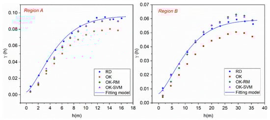 The reproduction results of the semi-variogram on the test point are shown in Figure 5. The semi-variogram of the estimated value of OK differs greatly from that of the true value, which also indicates that the “smoothing effect” causes a large error between the estimated value of OK and the true value in the spatial variation structure. The semi-variograms of OK-RM and OK-SVM are relatively close, but the results of OK-SVM are more consistent with the true value. This indicates that OK-SVM shows better performance in reflecting the real spatial variation structure characteristics of regional variables through spatial variability modification.