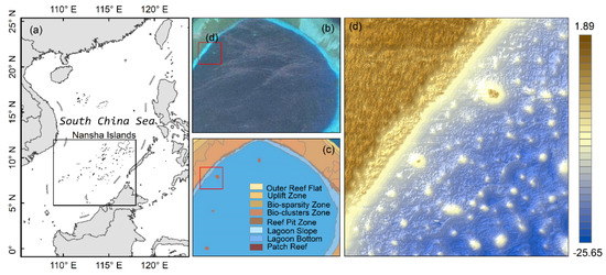 The study area is located in a typical coral atoll (Figure 7b) in the Nansha Islands of the South China Sea (Figure 7a). An area covering about 15 km2 in the north of the region was selected as the study area (Figure 7b). The study area contains most of the geomorphic types of reef flat and lagoon (Figure 7c), including bio-clusters zone, reef pit zone, lagoon slope, lagoon bottom, and patch reef, with strong spatial variability.