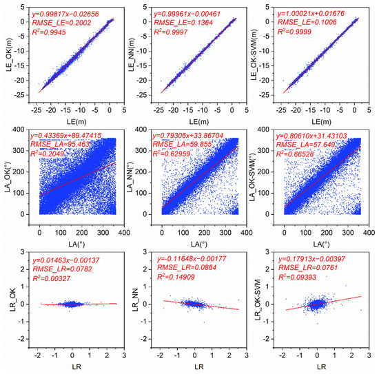 The numerical accuracy comparison (Figure 9) shows that the geomorphological surface reconstructed by OK-SVM is higher than OK in terms of local elevation, aspect, and convexity, and has a stronger correlation with the geomorphological generalization surface. Compared with the reconstruction results of NN, OK-SVM also has higher morphological numerical accuracy.