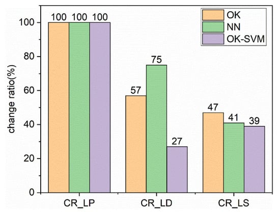 In cross-sectional comparison with OK and NN, which have excellent performance, the geomorphological surface reconstructed by OK-SVM is very close to the geomorphological generalization surface of coral reef, and it shows higher morphological numerical accuracy. A longitudinal comparison of the numerical accuracy indexes shows that the correlation between the reconstructed geomorphological surfaces and the geomorphological generalization surface in terms of LR is the lowest for NN, OK, or OK-SVM. The main reason is that the LR, the accuracy indicator of the “area” feature, is affected by the “smoothing effect” deeper than the other two numerical accuracy indicators. However, OK-SVM has relatively less accuracy loss in LR. In addition, OK-SVM has a relatively lower change ratio of morphological attributes. This is very critical, because morphological attributes are usually important parameters for the quantification and evolution of coral reef geomorphology [43,44]. Therefore, the collaborative spatial variability modification strategy of global parameters transformation, local residual correction, and extremum correction makes OK-SVM more adaptable in the geomorphological reconstruction of coral reefs with strong spatial variability. This will provide a guarantee for the subsequent accurate calculation of the multi-scale coral reef geomorphological parameters, which is beneficial to the research of active and passive remote sensing cooperative classification of coral reef geomorphology and analysis of coral reef ecological changes.