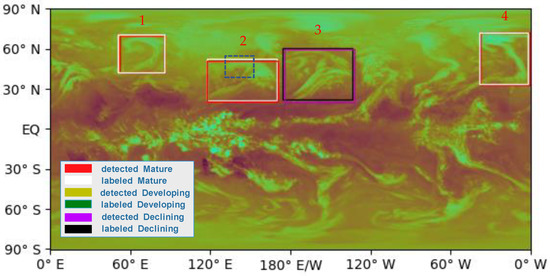 For the experiments with multiclass classification with all three ETC categories as an entire dataset, we saw a decreased performance compared with the experiments of datasets with individual categories of ETCs when trained with the same model and the same number of epochs. The results are most likely attributed to two reasons. One, there exist ambiguous labels within the dataset for which the cyclones are in transition stages; Two, for some ETC systems, it is hard to establish a clear boundary between them due to the embedding of one system into the other. Even though the samples for each category have been carefully selected, there still exist very few samples from different categories that resemble one another. Take the example of this picture (Number 2 in Figure 8). It is obvious that the picture contains ETCs of all three stages. While the model was right in locating and categorizing the ETCs of declining stage and mature stage, it somehow took the ETC of the developing stage as one that is in the mature stage. This is most likely because this particular sample of developing ETC was about to transition to a mature ETC, as the next picture shows (Figure 9), and this sample has the comparable size as that of a mature ETC. We can also notice that when the cyclone in (Number 2 Figure 9) was labeled as a mature ETC, there is a smaller ETC embedded into the center of this particular ETC (blue dotted rectangle in Figure 9). It is possible that the model mistook the first developing stage ETC because of the almost-developed center in (Figure 8), while in the next frame, this conception was enhanced due to the smaller ETC system resembling a strong cyclone center. This minor error creates some confusion between the model’s learned classification boundary of ETCs of the different categories, resulting in mistakes for the classifier during testing and hence lowering the accuracy of the model for detecting ETCs. As we can see, the SSD model classifies objects in a similar way like common Convolutional neural networks through learning the different features existing between the categories of ETCs and tries to establish classification boundaries within these categories. When these boundaries of classification were distorted for the above reasons, the model would fail to correctly determine the type of cyclones existed in an image. For the tasks with identifying ETCs of individual categories, the model would suffer less since it is working on a rather smaller dataset with less variation between samples. This makes it easy for the model to learn the boundaries to classify objects, since there is only one type of template to establish for the SSD model and fewer outliers to avoid.