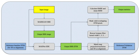In this work, we follow the same method to quantitatively evaluate the resultant 8 m/pixel CaSSIS DTMs and 2 m/pixel CaSSIS SRR-DTMs (target DTMs) using multiple smoothed versions of the 12.5 cm/pixel HiRISE SRR-DTMs (reference DTMs). We add the SSIM [65] scoring that measures the differences between structural features as an additional evaluation metric to complement and support the pixelwise difference measurements from RMSE. The overall evaluation workflow (as shown in Figure 4) consists of four steps (similar to [64]), including (a) map reprojection, down-sampling, and 3D co-alignment of the reference DTMs to match with the target DTMs; (b) applying odd-sized boxcar filters (i.e., 3 × 3, 5 × 5, 7 × 7, …) to smooth out the details of the reference DTMs; (c) masking out no-data and non-overlapping areas; and (d) calculating RMSEs and SSIMs for all valid overlapping DTM areas.