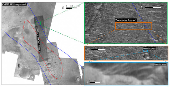 The above results (SRR image and SRR-DTM) are at a very high resolution with uniform quality and consistency and are being published through the ESA GSF. They are spatially co-registered and vertically co-aligned with respect to the cascaded HiRISE, CTX, and HRSC ORIs and DTM mosaics that are described in [28], which themselves are accurately co-registered with the ESA/DLR/FUB HRSC MC-11W level 5 ORI mosaic (available at http://hrscteam.dlr.de/HMC30 (accessed on 22 December 2021)), and vertically co-aligned with the aforementioned USGS MOLA areoid DTM. We use identical map projection system (Equidistant Cylindrical/Equirectangular) and map projection parameters as used in the ESA/DLR/FUB HRSC MC-11W level 5 ORI and DTM products. We strongly recommend that readers download the resultant products from ESA GSF and look at fine-scale details (they are also provided as supporting material for review purpose), since only very small exemplar areas (i.e., “Zoom-in Area-1” and “Zoom-in Area-2” in Figure 6) of the results are shown here in Section 3.2 and Section 3.3.