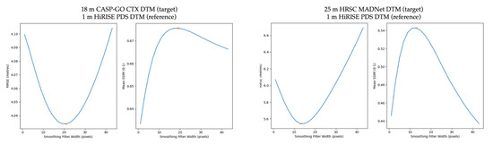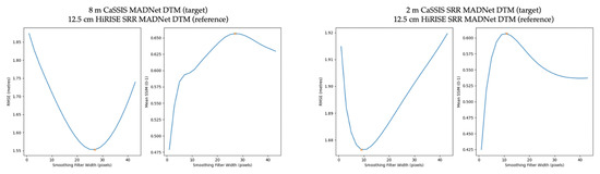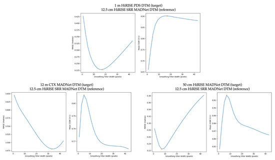 We then tried to use the HiRISE PDS DTMs to evaluate two even lower resolution DTMs, including the 18 m/pixel CTX CASP-GO (a photogrammetric DTM pipeline that is described in [20]) DTMs that were published in [28] and the 25 m/pixel HRSC MADNet DTM mosaic that was also published in [28], for which we do get reasonable RMSE and SSIM curves, which also agree with our visual inspections of the multiple smoothed versions of the HiRISE PDS DTMs. An example of the RMSE and SSIM plots between the target CTX CASP-GO DTM (J01_045167_1983_XN_18N024W-J03_045800_1983_XN_18N024W-DTM) and the reference HiRISE PDS DTM (DTEEC_039299_1985_047501_1985_L01), as well as an example of the RMSE and SSIM plots between the target HRSC MADNet DTM mosaic and the same reference HiRISE PDS DTM, are shown in Figure 9.