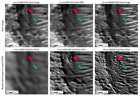 Figure 12 shows input images and shaded relief images of the output DTMs of an exemplar area over a subarea (south-west corner) of a small crater (centred at 24.3350°W, 18.0716°N) of the test site at Oxia Planum. The “red arrows” show an example of the CaSSIS features that are considered inaccurately super-resolved, where the “real” feature appears to be wider in the 25 cm/pixel HiRISE image, compared to the narrower appearance in the 1 m/pixel CaSSIS SRR image, and consequently, such features are inaccurately interpreted in 3D, where the “real” feature appears to be flatter and thicker in the 50 cm/pixel HiRISE MADNet DTM, compared to their steeper and thinner appearance in the 2 m/pixel CaSSIS SRR MADNet DTM. The “green arrows” show a counter example of the same features that are considered more accurately super-resolved, where the “real” feature appears to have a very similar width and shape in the HiRISE image and CaSSIS SRR image, and subsequently, results in a fairly similar appearance of its 3D shape and slope in the shaded relief images of the HiRISE MADNet DTM and the CaSSIS SRR MADNet DTM. This example demonstrates that the resultant CaSSIS SRR MADNet DTM contains a mixture of reliable topography as well as less accurate topography, though with obviously higher effective resolution.