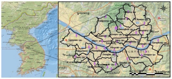 Location of the study area (City of Seoul). The total area is about 605.21 km2 and the population of the city is 9.8 million.