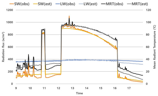 In contrast, longwave radiation estimated by MRT_GSV showed the lowest RMSE values among the three models. These results show that the calculation formula which uses the absorption rate of shortwave radiation can accurately estimate longwave radiation in clear weather, except at night [32]. These errors indicate surface temperature estimation and shortwave reflected radiation calculations can be improved in the models because there is a rapid change depending on shortwave radiation variation.
