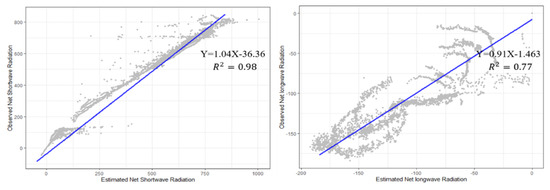 Figure 4 shows a consistent variation trend in the validation between the measured data and the estimated shortwave and longwave radiation. The estimated shortwave radiation was slightly higher than the measured data. The calculated and measured shortwave radiation values were between −19 and +23 W/m² during the daytime.