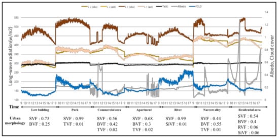 We estimated the longwave radiation by applying the heating coefficient value using the simplified surface energy balance equation. Because the sensible heat value is established based on the empirical formula of surface moisture and soil properties according to the temperature value, the accuracy is higher in dry weather [31,43]. By comparing the measured data, the longwave radiation of most areas decreased as cloud faction increased. However, there is a negative correlation between cloud faction and longwave radiation at parks and rivers area.