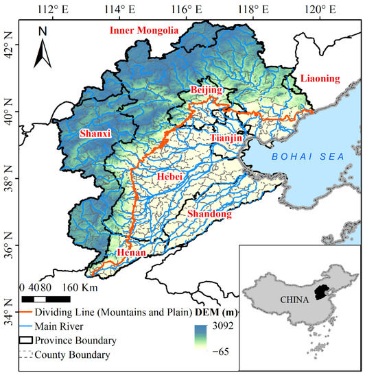 The Haihe River Basin is the largest river basin in the North China Plain, located at 112–120°E and 35–44°N (Figure 1). It covers Beijing, Tianjin, Shijiazhuang, and 23 other large and medium-sized cities, encompassing the mountainous regions in the north and west as well as the plain areas in the south and east [29]. The multi-year average precipitation of the area was 532 mm, with most of the precipitation received from June to September (accounting for 75–85% of the total annual precipitation). The multi-year average air temperature was 10.0 °C, which belongs to the continental monsoon climate zone. The primary land-use types in the basin are grassland, cropland, and deciduous broadleaf forest (DBF). Grassland is mainly distributed in the mountainous areas, cropland is located in the plain areas, and woodland covers the low mountainous areas. In China’s political economy, HRB occupies an important position [22], carrying the development of the Beijing-Tianjin-Hebei urban agglomeration. Given the high degree of overlap between HRB and the Beijing-Tianjin-Hebei provinces, the study area comprised a union set of the two regions. The total area of the study region was 342,697.7 km2.