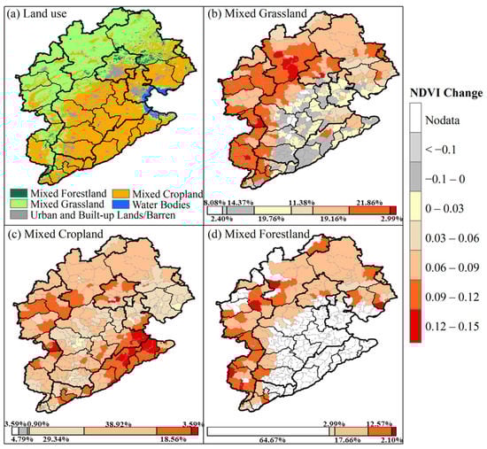 (a) Land cover categorization map of the study area in 2002; (b–d) depict the difference in normalized difference vegetation index (NDVI) between 2018 and 2002 for mixed grassland, cropland, and forestland, respectively. The horizontal bar in each panel shows the frequency of each change level. Nodata means there is no corresponding vegetation type in this county.
