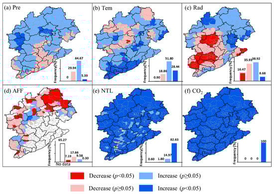 Interannual linear trends of (a) precipitation rate, Pre; (b) 2-m air temperature, Tem; (c) downward shortwave radiation, Rad; (d) area of afforestation (AAF); (e) nighttime light (NTL); and (f) CO2 from 2002 to 2018. Significant trends indicate p-value < 0.05. The histogram in each panel shows the frequency of various trends, and the negative/positive values represent the decreased/increased trends. White color means no data in this county.