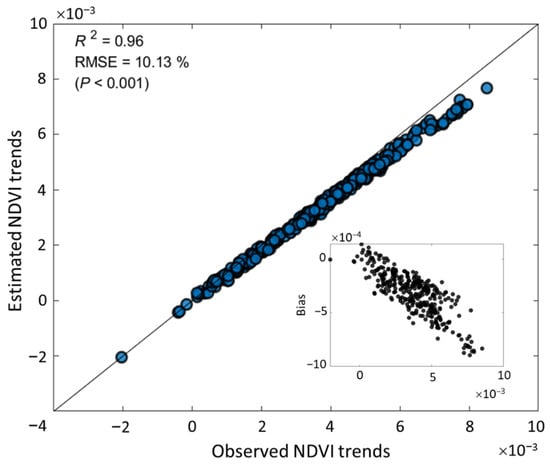 Relationship between observed and estimated slopes of annual normalized difference vegetation index (NDVI) in 334 counties. Inset: changes in bias against observed NDVI trends.