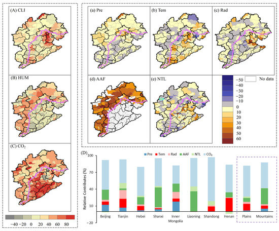 The contribution of CLI ranged from −20% to 85% and was larger in the surrounding areas of Tianjin. The positive effects of Pre on NDVI trends were displayed in Beijing, the western part of Hebei Province, northern part of Shanxi Province, and the Inner Mongolian province (Figure 6a). The positive contribution of Pre to NDVI trends was largest in the Inner Mongolian province, with a value of >25%, and the negative contributions were relatively minor, with a value around −10% in the south-eastern area. Croplands cover a substantial portion of the south-eastern region, which had a negative influence. Because of irrigation activities, the natural response of precipitation-soil moisture is disturbed, and the water stress is mitigated, thus creating a low negative contribution of precipitation to the NDVI. Generally, the contribution of Tem to NDVI trends ranged from −40% to 65%, with a mean of 9.26% (Figure 6b). Approximately three-quarters (76.12%) of the study area located in the south-eastern area, exhibited a positive contribution, especially in Tianjin, Shijiazhuang in Hebei Province, and Anyang city in Henan Province (>50%). The negative effects of Tem on NDVI trends appeared in most areas of the north-western region, particularly in Baoding and Tangshan in Hebei Province (<−10%). Additionally, the mean contribution of Rad to the NDVI trends was 3.17% (Figure 6c). Over 60% of the areas showed a positive contribution, with a maximum value of 45.24%. Relatively large negative contributions (<−5%) were observed in the southern and central parts of the entire region.