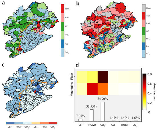Dominant variable to (a) normalized difference vegetation index (NDVI) increase and (b) NDVI decrease. (c) Spatial distribution of driving contributors (CO2: rising CO2, CLI: climate change, and HUM: human activities) to NDVI trends. (d) Fractional area (%) of counties ascribed to different contributors over mountainous and plain areas. The label at the top of the bar is the fraction of counties dominantly driven by each contributor. A postfix ‘+’ indicates a positive effect on NDVI trends, whereas ‘−’ indicates a negative effect.