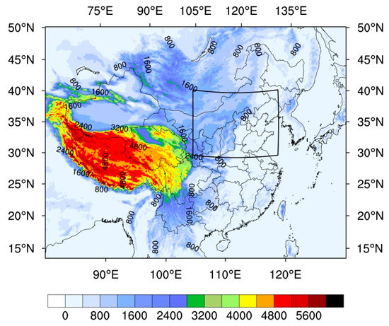 RMAPS-ST is short for the Rapid-refresh Multi-scale Analysis and Prediction System—Short-term, which is a km-scale regional NWP system developed based on the Weather Research and Forecasting model (WRF) and WRF data assimilation (WRFDA) [26,27,28]. The latest RMAPS-ST has been updated with the version 4.1.2 of WRF. The system of RMAPS-ST focuses on short-range forecast over North China, serving mainly the meteorological decision-making in Beijing area. It has two nested domains, as shown in Figure 1. The outside domain, which covers the entire China region, has 649 × 500 grid points with a resolution of 9 km. It has also more complex terrain features especially in the western, which directly influence its synoptic features. The inner domain locates in North China, with a resolution of 3 km and 550 × 424 grid points. In particular, near real-time green vegetation fraction (GVF) and soil moisture are used in the inner domain [29,30]. Latest land use with finer classification is also employed in the 3-km domain.