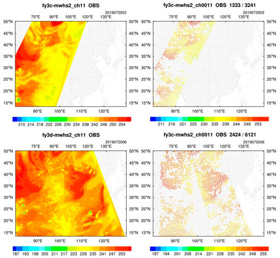 Figure 2 shows the spatial distribution of MWSH-2 channel 11 brightness temperatures before and after all quality control procedures. The first line is from satellite FY-3C at 0300 UTC on 20 July 2019, and the second line is from satellite FY-3D at 0600 UTC on the same day. It can be seen that 1333 observations out of total 3241 are retained at 0300 UTC and 2424 out of total 6121 retained at 0600 UTC. That is, about 1/3 of the total observations are remained for data assimilation after quality control. A polar-orbiting satellite typically passes over a specific region twice per day [31]. The satellites of FY-3C and FY-3D can provide relatively rich measurements over the 9-km domain for the RMAPS-ST system at about 0300, 0600, 1500, and 1800 UTC every day.