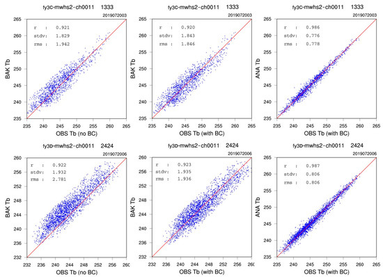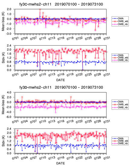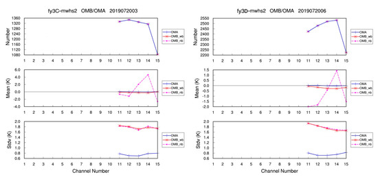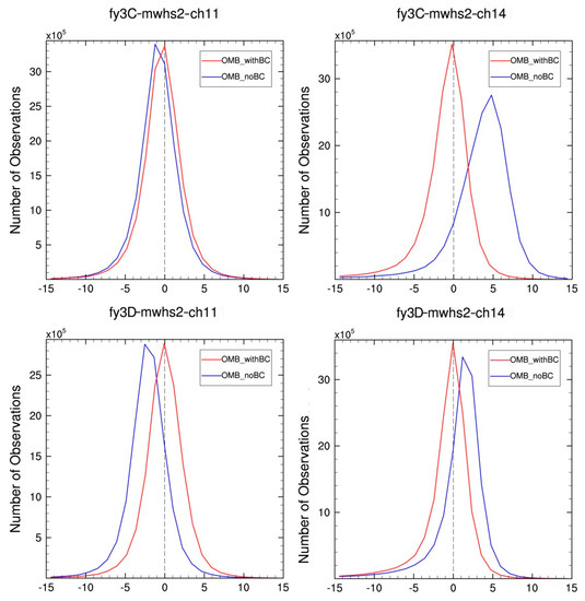 Since the systematic errors in both the observations and the background are assumed to be unbiased according to the formulation of the 3D-Var method [4,34], the observation innovations (observation minus background, OMB) should follow a Gaussian error distribution after quality control and bias correction. Figure 3 gives the histograms of the brightness temperature innovations distribution with (red) and without bias correction (blue) for MWHS-2 channels 11 and 14 from FY-3C and FY-3D, respectively. In comparison to the innovations without bias correction, the histograms of the brightness temperature innovations with bias correction exhibit approximate Gaussian distributions and the mean values are closer to zero. The MWHS-2 observations are colder in channel 11 and warmer in channel 14 than the brightness temperatures calculated from the RMAPS-ST background prior to the bias correction. The results indicated that a good bias performance can be achieved through bias correction.