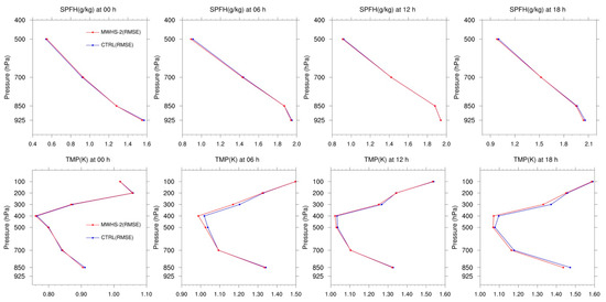 RMSEs of the forecast humidity (first row) and temperature (second row) profiles for CTRL (blue line) and MWHS-2 (red line) experiments against observations at 00 h, 06 h, 12 h and 18 h of the forecasts.