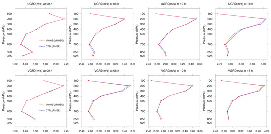 Adjustments on the initial conditions resulting from MWHS-2 radiances may also influence other atmospheric components. Figure 8 gives the mean values of RMSE for the forecasting wind in zonal (UGRD) and meridional (VGRD) directions against sounding observations. At the starting time 00 h of the forecasts, there is little difference in the error between the CTRL and the MWHS-2, except for a slight reduction of the RMSE on low level in the MWHS-2 experiment. In the short-range forecast of 0–18 h, the RMSE below 200 hPa has an overall small reduction for the zonal wind. And the improvement is more obvious as the forecast time advancing, especially for middle and low levels. For the meridional wind, MWHS-S radiances have a similar effect to the zonal wind, but a smaller improvement on the low levels. Meanwhile, MWHS-2 radiances give a relatively obvious improvement around 200 hPa and 300 hPa at 06 h and 18 h of the forecast for the meridional wind.