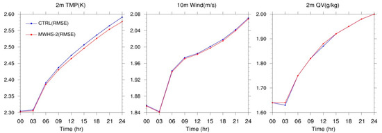 RMSEs of the temperature (TMP) at 2 m (left), the wind at 10 m (middle), and the humidity (Qv) at 2 m (right) over the forecast time of 0–24 h against observations for CTRL (blue) and MWHS-2 (red) experiments.