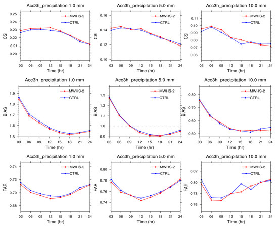 The CSI, BIAS and FAR scores of 3-h accumulated precipitation from the CTRL and the MWHS-2 forecasts in the 9-km domain for the threshold of 1.0 mm, 5.0 mm and 10.0 mm.