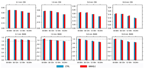 The CSI and BIAS scores of 6-h accumulated precipitation from the CTRL and the MWHS-2 forecasts in the nested 3-km domain for the threshold of 0.1 mm, 1.0 mm, 5.0 mm, and 10.0 mm.