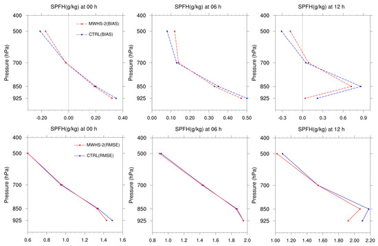 To investigate the impact of MWHS-2 radiance data on the short-range forecast in the system of RMAPS-ST, two groups of the 24-h forecasts with and without MWHS-2 radiance data assimilation are compared and evaluated against observations. Figure 7 gives the mean values of RMSE for humidity and temperature profiles over one month, from 1 July 2019 to 31 July 2019, including 248 forecasts in each group of experiments. At the beginning of the forecast (00 h), there is only a slight improvement at 850 hPa for humidity profile. In the 6–18 h of the forecast, the RMSE of the humidity field around 500 hPa also has a small reduction. For temperature profile, the error of each level has been slightly reduced except for the 700 hPa at the starting time of the forecast. An improvement appears between 300 hPa and 850 hPa in the next 12 h forecast, which is relatively obvious around 400 hPa. The RMSE of temperature at low level of 850 hPa has a continuous reduction during the forecast of 0–18 h. The assimilation of MWHS-2 radiance data can see a small improvement on middle and low levels of both humidity and temperature in the short-range forecast of the RMAPS-ST system.