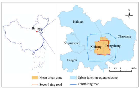 Beijing is located at 115.7°–117.4°E and 39.4°–41.6°N, with an area of 16,410.54 (Figure 1). Beijing is the political, cultural, scientific and technological, and innovation center of China []. The spatial pattern of Beijing takes the old city as the center and gradually expands outward, showing a concentric circle development pattern. We chose the inner region of the fourth ring road and the second ring road as our two research areas. The total area within the second ring road is about 62 , and this is the old city. Buildings in the center part along the south to north of this region are mainly traditional dwellings with courtyards, with a lower building height and higher density, and higher buildings are mainly distributed along Chang’an Street and the second ring road. The fourth ring road covers an area of approximately 302 and is comprised of a highly built-up urban landscape.