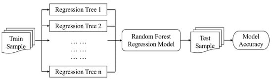 Random forest is a bagging ensemble machine learning algorithm [], which is mainly applied in classification and regression. It has been widely used in economics, statistics, the medical field, environmental studies and many other fields [,,,]. One of the advantages of the tree model is that it can remove the multicollinearity between independent variables in the regression process. It also has a strong ability to learn data sets, and so is suitable for the regression task with a large sample []. Random forest regression (RFR) is a kind of integration algorithm based on a regression tree model []. Compared with a traditional linear regression model, RFR has higher accuracy with the same data set and can handle higher dimensional feature sets because of its low sensitivity to the outliers in the data set with a lower risk of over fitting, especially for the absence of some characteristics in the data set []. The RFR algorithm establishes several parallel regression trees during regression and obtains the regression accuracy of each parallel tree, and the regression accuracy of the whole forest is given by the average accuracy of all regression trees (Figure 4). In this study, surface temperature was used as a label, and different landscape metrics (15) were used as regression features. The results on each scale in the two study areas were made into 16 columns and several rows (sample number) of data sets which were input into the RFR model for regression. The training set used 70% of the randomly established tree model, and the remaining 30% was used as the test set to test the regression accuracy of the model. Finally, the RFR accuracy of the landscape metrics and LST at various scales in the two study areas were obtained with the feature importance of each metric.