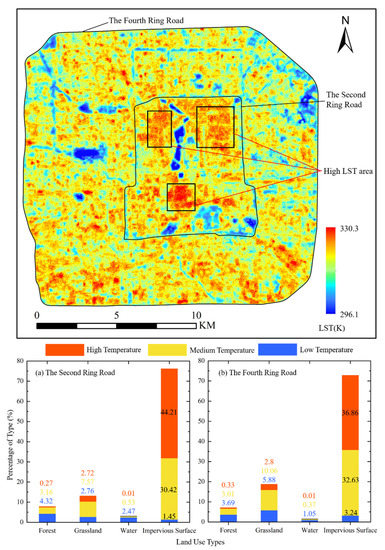 The distribution of LST and the proportion of land types at different temperature levels in the study area. (a) the second ring road; (b) the fourth ring road.