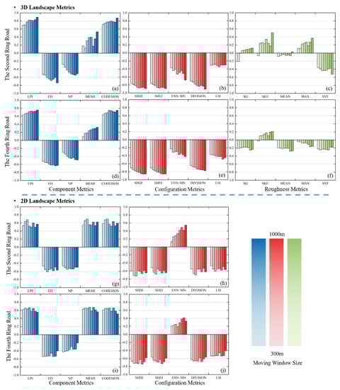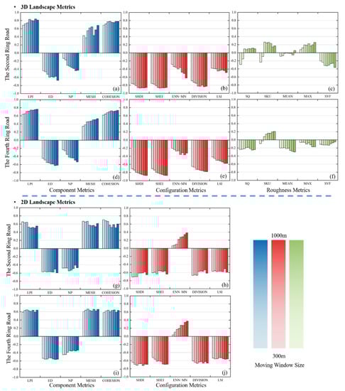 PCC between LST and landscape metrics at 30 m grain size. (a–f) PCC between LST and 3D landscape metrics at 30 m grain size; (g–j) PCC between LST and 2D landscape metrics at 30 m grain size.