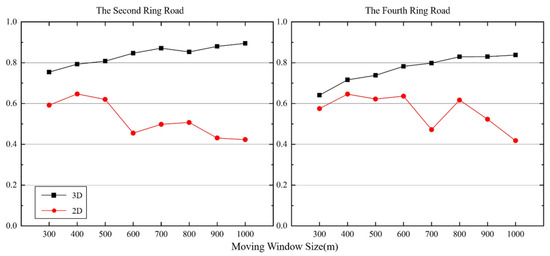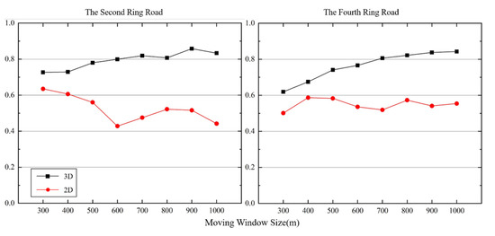 In this paper, the data set made at the initial stage of the experiment was first input into the multiple linear regression model to compare with the RFR model. The results showed that the interpretation effect of the 3D landscape metrics on LST was better than that of the 2D landscape metrics in both study areas from the view of regression accuracy (Figure 8) which was already proved by some previous studies [,]. The linear regression accuracy between 3D metrics and LST increased steadily with the increase of rectangle size, and the increase slowed down when the rectangle size reached 700 m. The linear regression accuracy in the second ring road is higher than that in the fourth ring road. The linear regression accuracy of the 3D landscape metrics and LST in the second ring road increased from 0.76 to 0.90, and in the fourth ring road increased from 0.63 to 0.83. The accuracy of the linear regression between the 2D landscape metrics and LST fluctuated and decreased with the increase of the rectangle size. The multiple linear regression accuracy of the 2D landscape metrics and LST decreased from 0.60 to 0.41 in the second ring road, and from 0.58 to 0.40 in the fourth ring road. In addition, the multiple linear regression accuracy was higher in the second ring road. This is because the proportion of impervious surfaces of the second ring road is higher than that of the fourth ring road, which means more buildings (3D landscape features) in the area which make the value differences more significant between the 3D and 2D landscape metrics.
