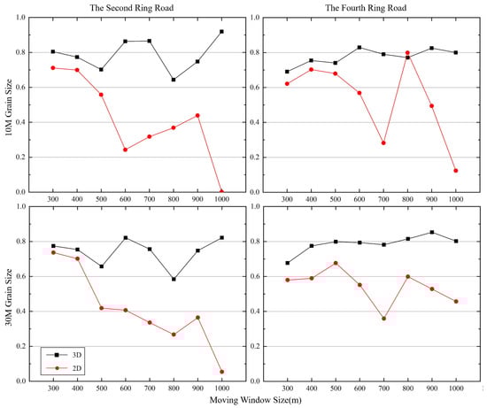 The linear regression accuracy of landscape metrics and LST at 30 m grain size (Figure 9) is also very similar to that of the 10 m grain size. The accuracy of the 3D landscape metrics and LST linear regression increases with the increase of the rectangle size, while the accuracy of the 2D landscape metrics and LST decreased with the increase of the rectangle size, and the accuracy of the second ring road was slightly higher than that of the fourth ring road. The linear regression accuracy of 3D in the second ring area increased from 0.72 to 0.85, and in the fourth ring road increased from 0.60 to 0.83. This phenomenon was similar to the results obtained in Section 3.2.2, indicating that, although the change of research granularity cannot change the overall landscape pattern of the study area, it can describe the landscape pattern of the study area more accurately.