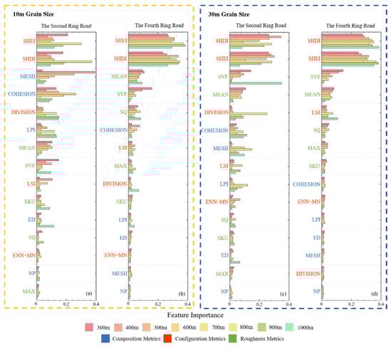 Feature importance of 3D landscape metrics to LST in RFR. (a,b) are the feature importance of each metrics at 10 m grain size; (c,d) are the feature importance of each metrics at 30 m grain size.