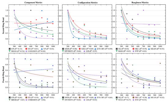 The CORV of different 3D landscape metrics fitted by the power function obtained the optimal rectangle size for analyzing the relationship between LST and the 3D landscape pattern. The results of each metric varied at a great magnitude, and normalization was conducted before the fitting to homogenize the CORV of metrics with significant differences. Figure 12 shows the CORV of each 3D landscape metric at the 10 m grain size. The abscissa is the size of different rectangles (m), and the of each power function fitting is displayed below each figure. It can be seen that the fitting accuracy of the CORV of most metrics was high, and the CORV decreased with the increase of the rectangle size. The CORV decreased rapidly when the rectangle size was between 300 m to 500 m. They approached the minimum value and tended to be stable when the rectangle size reached 700 m. Among the 15 metrics in the second ring road, the of the CORV power function fitting of nine metrics, such as COHESION, was higher than 0.8; the fitting of DIVISION was between 0.6–0.8 (0.66); and the fitting of the remaining five landscape metrics, such as LPI and ED, was less than 0.3. The fitting accuracy of CORV in the fourth ring road was lower than that in the second ring road. The fitting of MESH and COHESION was higher than 0.8, the LPI and MEAN was between 0.6–0.8, the SHDI and other three metrics were between 0.4–0.6, and the ED and other four metrics were less than 0.3.