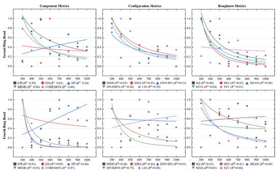 Figure 13 is the power fitting of the normalized CORV of each 3D landscape metric at the 30 m grain size. In the second ring road, the power fitting of MESH and the other six metrics was higher than 0.8; the fitting of SHDI and SHEI was between 0.6 and 0.8; the of LPI, COHESION and LSI was between 0.4 and 0.6; and the ED and the other four metrics had an extremely low . The fitting accuracy of CORV in the fourth ring road was lower than in the second ring road at the 30 m grain size as well. The of MESH and COHESION was higher than 0.8; the of LPI, DIVISION and MEAN was between 0.6 and 0.8; the of SHDI and the other four metrics was between 0.4 and 0.6; and the of ED and other six metrics were hard to reach, at 0.3.
