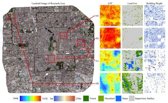 Comparison of LST, land use and building height in some typical areas of the study area. (a) high LST area with more vegetation; (b) high LST area with less vegetation; (c,d) are low LST area.