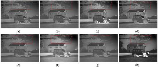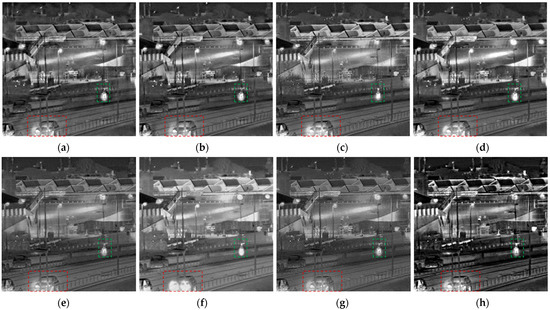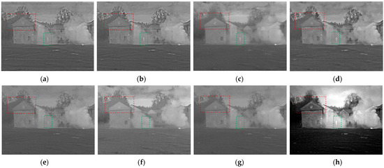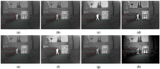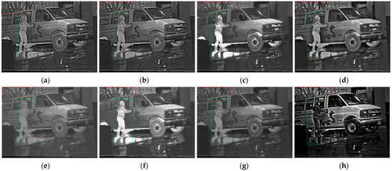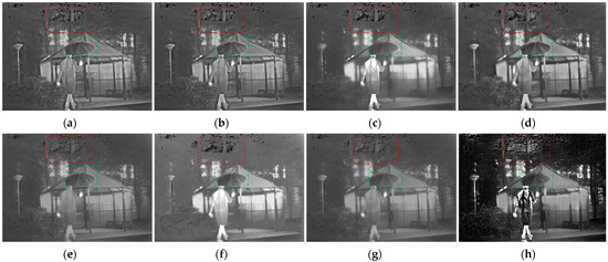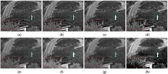 The subjective evaluation for the fusion of the infrared and visible images depends on the visual effect of fused images. As shown in Figure 7a–h, Figure 8a–h, Figure 9a–h, Figure 10a–h, Figure 11a–h, Figure 12a–h and Figure 13a–h, each method has its advantage in preserving detail components, but our method can balance the relationship between retaining significant details and maintaining the overall intensity distribution as much as possible. Through experiments and analysis, the novel algorithm can enhance the contrast ratio of the visible image, and enrich the image detail information; moreover, the noise can also be well limited.